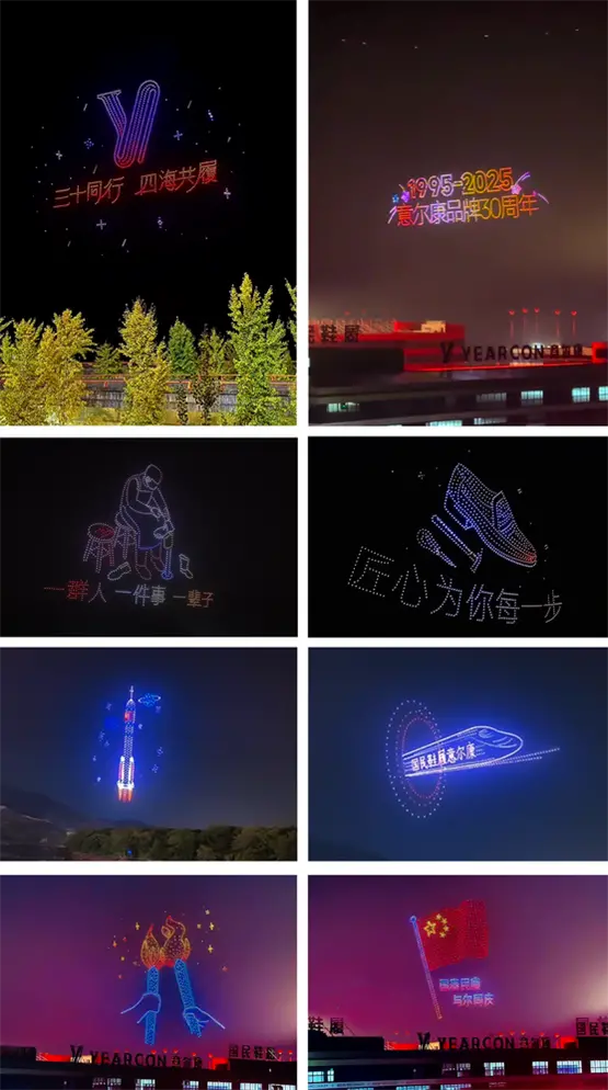 家宴之后,压轴登场的大型无人机表演,将当晚的情感推向了高潮。以夜空为幕布,“国民鞋履”“匠心为你每一步”“神六飞天”“意尔康号高铁”等字样图案次第绽放,璀璨光影不仅是一场视觉盛宴,更是对全体员工三十年匠心坚守的崇高礼赞。“当那个代表我们制鞋人的剪影在夜空中亮起时,我身边很多老同事眼眶都湿了。”一位参与活动的员工向记者描述,“我们日复一日的平凡付出,在这一刻仿佛都被看见了,被记住了。”